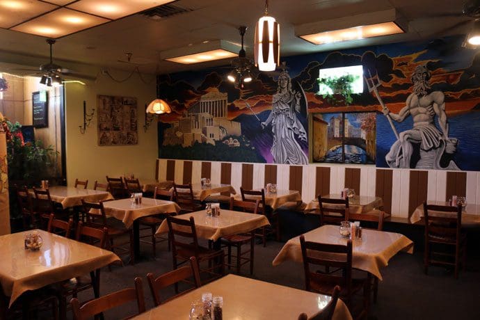 Chef Seabrook checked up on us several times during our visit. He’s an engaging fellow with an aim-to-please customer orientation that’s reflected on the restaurant’s wait staff. Because everything is made to order, a meal at the Olive Branch is nicely paced, not rushed. There’s something to see on every one of the restaurant’s walls, including tea towels with recipes for Greek standards. Then, of course, there’s the mural of the Olympic gods watching over you as if to make sure you finish everything on your plate.