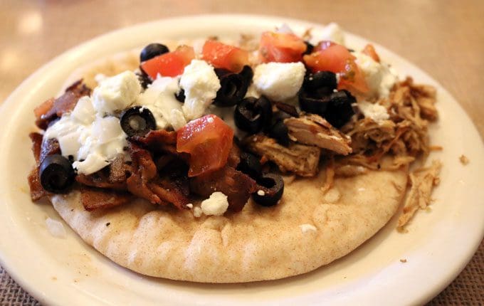 Gyros, the traditional Greek fast food wrap stuffed with meat, vegetables, and Tzatziki, are served open-face style at the Olive Branch. A large, flat pita served warm is topped with the restaurant’s signature lamb or chicken, black olives, tomatoes, feta and your choice of traditional or spicy Tzatziki sauce. For a blend of flavors, ask the accommodating staff for both lamb and chicken. Both are good. If you like sharp, tangy feta, you’ll appreciate the large chunks which adorn the gyro. For me, there can never be enough Tzatziki, that sauce made from Greek-style yogurt, diced cucumbers, dill weed and a small amount of vinegar. Make sure you ask for a second portion, and make it the spicy version which packs a punch.