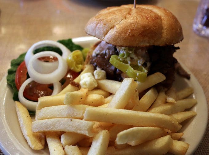 “Release the Kraken!” If everything you ever learned about Greek mythology comes from the campy 80s movie Clash of the Titans, you probably believe the Kraken is a mythological sea monster released by Zeus to destroy Argos for its insolence. In actuality, the Kraken is nowhere to be found in Greek myths. Its origins are Nordic. In any case, you’ll be happy that the Olive Branch has released The Kraken (the restaurant’s signature lamb piled on a ground beef patty topped with feta, spicy or traditional Tzatziki sauce and pepperoncini) on its burgers menu. The combination of a ground beef patty and lamb brings out the best in both, but my favorite elements on this behemoth creation–where its personality comes from–is the spicy Tzatziki and lip-pursing pepperoncini. The Kraken is served with fries (out-of-a-bag and nothing special).