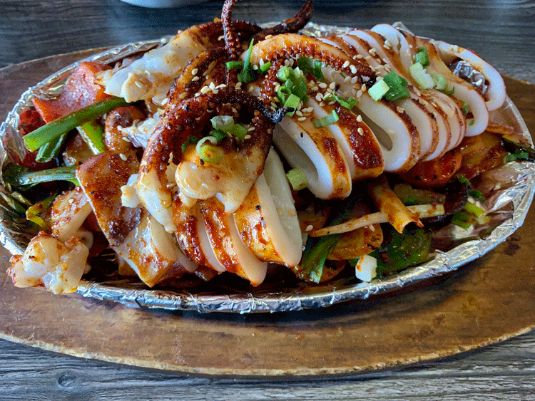 23 October 2019: Other than Asian restaurants, it seems many eateries haven’t figured out you can do more with squid than serve it as deep-fried calamari. Perhaps no one loves squid more than Koreans who prefer it stir-fried in a spicy and tangy Gochujang (Korean red chili paste) with fresh vegetables. Sushi & Sake’s spicy squid dish is one of the most esthetic and appealing squid dishes you’ll ever see, a veritable culinary work-of-art. In Korea, spicy squid is served with a bowl of rice because it’s made too spicy to eat alone. This fire-eater would certainly have appreciated more heat in my dish, but perhaps I’m an outlier. A gentleman sitting one table over was perspiring profusely from the heat. Ringlets and tentacles of perfectly stir-fried squid with a slightly elastic texture were pleasing, but the accompanied vegetables (white and green onions, green and red peppers) were most memorable.