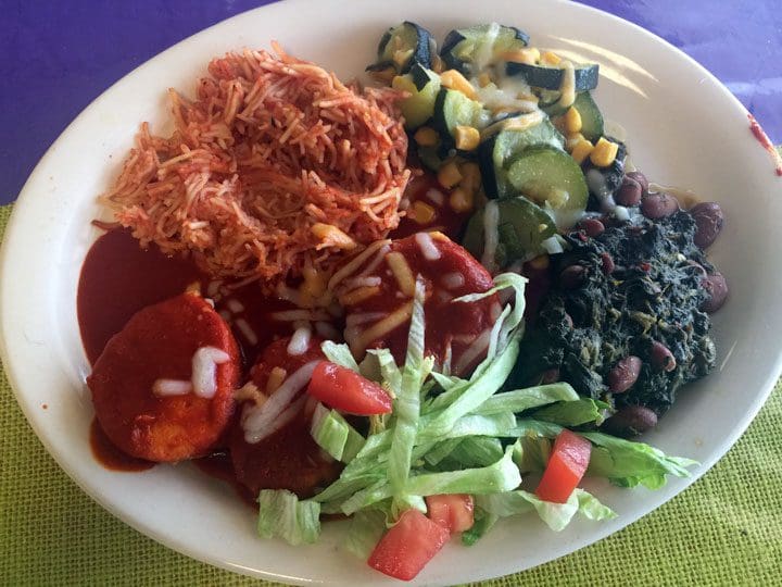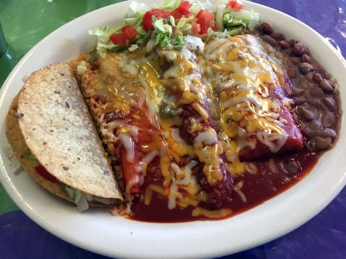 16 June 2016: You can have your enchiladas constructed with cheese, ground beef, chicken or carne adovada and on either blue- or yellow-corn tortillas. Regardless of filling you choose, make it an early Christmas and ask for both red and green chile. For good measure ask for at least one fried egg (over easy) on top. The chile is hot! For a fire-eater, it’s not necessarily piquant, but it’s served piping hot, not lukewarm. It’s a very good, earthy chile, unadorned with seasonings that don’t belong on New Mexican food. Both the red and green are about even on the piquancy scale and both are absolutely delicious. The accompanying beans will remind you of those prepared by your abuelita while the Spanish rice is…well, it’s Spanish rice.