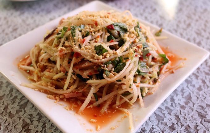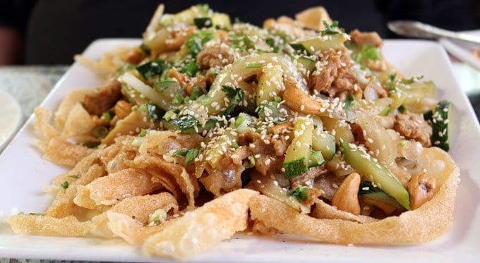24 June 2016: That would be the papaya salad, the very best my Kim and I have ever had. A fresh and invigorating starter possessing more mouth-pleasing qualities than any salad in recent memory, it’s artfully plated and large enough to share. Matchstick-like slivers of papaya resembling noodles are tossed with fresh basil, chopped peanuts, ground chili and mock ham in a shallow pool of pleasantly piquant “fishless” sauce with tangy citrusy notes. You’ll be tempted to lap it up off your plate when the last remnants of the salad have been polished off.