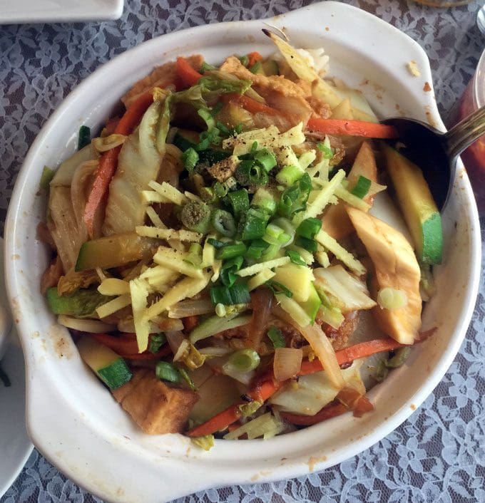 21 November 2016: Deciding to pursue a vegetarian lifestyle is the easy part. Preparing palatable vegetarian dishes at home or discovering restaurants which make them delicious takes a little more work. When my friend Elaine, already one of the most healthy and fit people I know, decided to try vegetarianism, she asked me to take her to my favorite vegetarian restaurant. It didn’t take much deliberation to decide where we’d go. Not surprisingly, Hy Quan exceeded her expectations. Elaine fell in love with the papaya salad and egg rolls, but it may have been the clay hot pot rice dish we split (and couldn’t finish) which most excited her. Clay pot cooking is very popular throughout Asia where the clay pot is used as both pot and serving vessel. Aside from rice, this dish contains an assortment of vegetables (carrots, cabbage, zucchini and green onion) prepared perfectly as is the accompanying tofu. The dish has a a smoky, wok-fried flavor with crispy, fresh vegetables and at the bottom edges of the pot, amazing caramelized rice which Bill confirmed is the most popular feature of a terrific dish.