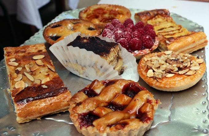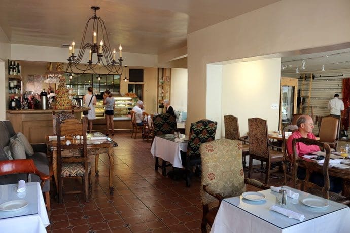 Weather-permitted, the courtyard is definitely preferred seating. If the courtyard is full, there are a few tables preceding the front entrance that’ll give you a great view of the street activity. The space which houses Chez Mamou is bisected into two halves, one occupied by Noëlla Jewelry Couture. Decor is tasteful and homey. Step up into the cafe and your eyes will immediately gravitate toward the pastry case with its colorful display of pastries, breads, croissant and other French baked delicacies. Few display cases in New Mexico are as lovely. You’ll want to order the chocolate croissants the minute you walk in or you risk the cafe running out entirely.