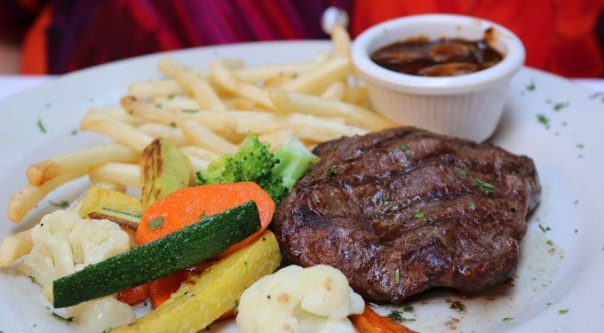 Because she missed the French fries often served with mussels (who doesn’t love moules frites?), my Kim’s choice of entree was the Steak Frites, a flank steak served with a pile of French fries and assorted vegetables. After recent encounters with sinewy, tough ribeye steaks, we were delighted to find the flank steak tender and absolutely delicious (in Kim’s estimation, better than a much more expensive steak at Ruth’s Chris). Prepared and seasoned to her exacting specifications, it didn’t even need the delectable mushrooms in gravy (not quite duxelles style) though they, too, were mouth-watering. So were the vegetables (carrots, broccoli, zucchini, cauliflower) which were so good even avowed vegetable-haters of all ages would enjoy them. Alas, the frites were strictly out-of-a-bag quality, a far cry from the twice-fried frites we enjoyed in Europe and now in La Quiche Parisienne in Albuquerque.