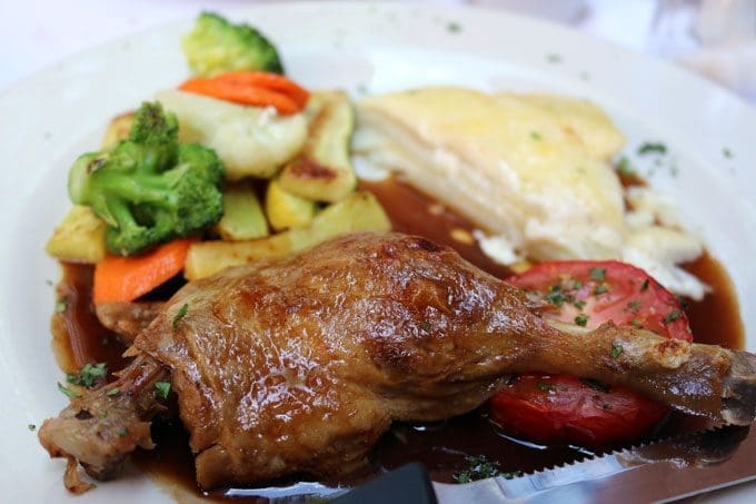 One of the more challenging decisions we faced during our inaugural visit was how to enjoy the duck which is prepared three different ways: duck confit, duck confit pasta and duck confit salad. The duck confit (red wine demi glace over slowly cooked duck) served with fresh roasted tomato, seasonal vegetables and potatoes au gratin had me at au gratin, a potato dish served often at French restaurants bur almost nowhere else. A layer of Gruyere blanketed the perfectly prepared potatoes, imparting a creamy texture, richness and saltiness. As with the aforementioned mussels, the superb red wine demi glace beckoned for bread so as not to leave a single drop on the plate. It was one of the best demi glace preparations we’ve had at any French restaurant in New Mexico. The duck, too, was well prepared and nicely seasoned with dark meat qualities showcased in every bite.