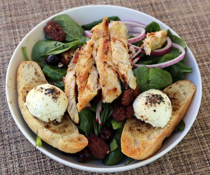 Whenever my mom chided me for not liking some traditional Northern New Mexican dish (boiled turnips, anyone), I had a two word retort—“goat cheese.” As do many people, she finds goat cheese off-putting in both aroma and flavor. That’s not surprising. Goat cheese has as many detractors as it does proponents. Count my Kim and I among the latter. We count goat cheese among our favorite frommages. Torinos’ goat cheese salad (spinach, Nicoise olives, red onion and candied pecans drizzled with a sweet Balsamic dressing and served with two crostinis topped with honey goat cheese) gave us another way to enjoy it. Our favorite component of an excellent salad was, of course, the honey goat cheese. The combination of tart, slightly sour goat cheese with the liquid gold sweetness of honey blew us away. It’s possible even my mom would have liked it, but if not, that just means more for us.