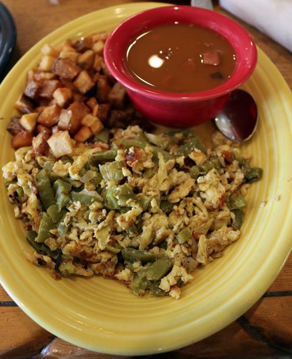 There are several breakfast items you’ll certainly want to try. One of those is eggs and nopalitos, two eggs scrambled with nopalitos, tomatoes and onions, served side of Casa potatoes and charro beans with two corn tortillas. Don’t let the fact that nopalitos are the edible young pads of the prickly pear cactus dissuade you from enjoying a truly tasty dish. Yesa, the pesky, prickly cactus spines are removed and no, nopalitos don’t taste like chicken. Nopalitos have a distinctive herbaceous-sour flavor and a better flavor than so many other “vegetables.” The accompanying charro beans are magnificent, among the best we’ve ever had. Perfectly prepared pintos with pieces of hot dog and bacon, those charros are championship caliber.