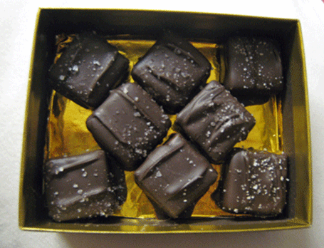Theobroma has got assortments of chocolate truffles in every flavor: hazelnut, butter pecan champagne, coffee, amaretto, mint, cappuccino, rum, raspberry, Irish cream, Tiramisu and orange. It’s got milk chocolate and dark chocolate and everything in between. It’s even got chocolate covered Oreos and ChacoPop, popcorn smothered in milk chocolate (or caramel, if you prefer). It’s got chocolate covered caramel kissed with sea salt, a delicious treat that will make macho men swoon. It’s got piñon covered chocolate bark that you’d kill for.