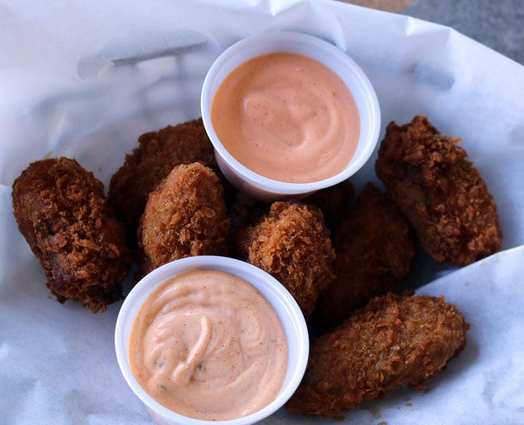 Anthony Bourdain described his life-changing experience of eating a raw oyster: “It tasted of seawater…of brine and flesh…and, somehow…of the future.” My own first experience wasn’t quite as epiphanic as Bourdain’s though like him, I embraced the new experience with gusto. It was love at first bite that quickly grew to include oysters in any form. During our eight years on the Mississippi Gulf Coast, I devoured oysters by the netful, sometimes right off the boat. Obviously, oysters that fresh aren’t available in landlocked New Mexico. Still, you can find pretty tasty oysters if you look. Count K’Lynn’s oysters among them. Available as a starter or entree, these battered plump juicy oysters are sheathed in a crunchy coating then fried. Bite into the coating and you’re rewarded with the unique umami-rich flavor that characterizes fried oysters. They’re served with your choice of several dipping sauces, including a New Orleans quality Cajun remoulade.