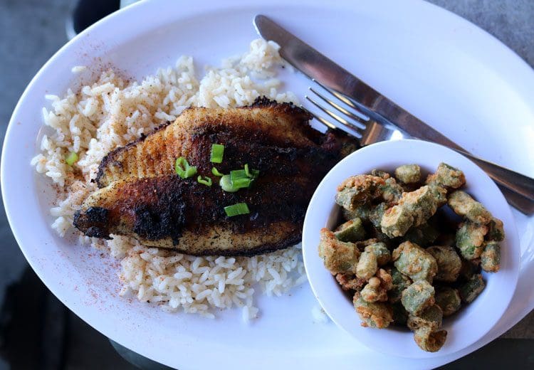 The operative word there is, of course, “almost.” There’s no way you’ll pass up a morsel of this beautiful dish: fried (or blackened) catfish topped with a zesty, creamy crawfish étouffée garnished with green onions and served over rice with a side of okra. On any list of Cajun food pairings, this one should rank rather high. You’ll want to sop up every bit of that creamy étouffée so make sure you order a side or three of cornbread…or dip the okra into it. This is a superb dish!