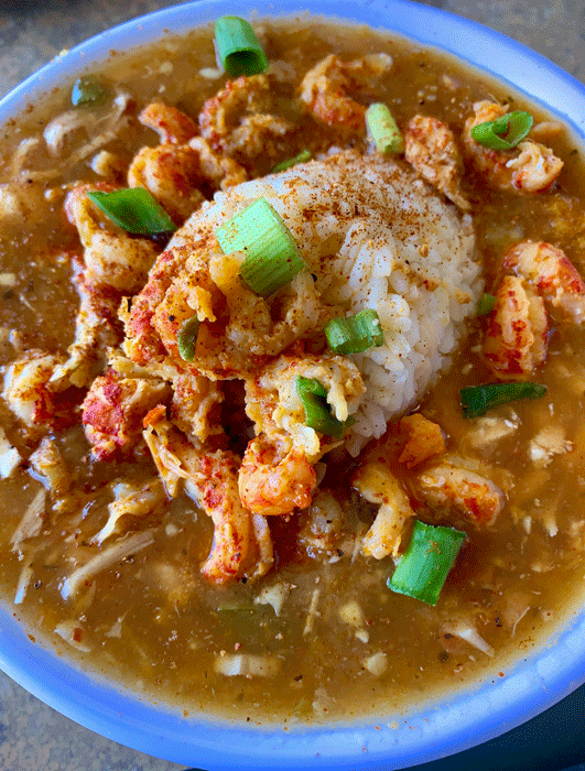 Per my avian appetite, I got some Gumbo to go instead. For this AM’s review, miked up a sample. Blush, never had it before…Whoa, Muy Sabrosa! Très Savoureux! Looking forward to suppaah…