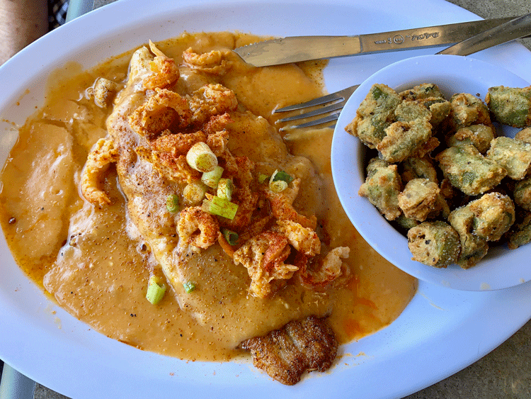That pithy observation is certainly true of K’Lynn’s blackened catfish, a dish so light and tender that it flakes off with a fork. It’s much like Prudhomme would have prepared it, meaning it’s seared, not charred and it’s seasoned for flavor not for assertiveness. You can actually taste the catfish and that’s the point. We had blackened catfish in New Orleans so emboldened with spices that we couldn’t taste the fish. The blackened catfish is served atop a bed of rice and is served with fried okra or red beans and rice. Ask for the okra, so lightly breaded and delicate that it’s almost like eating it raw.