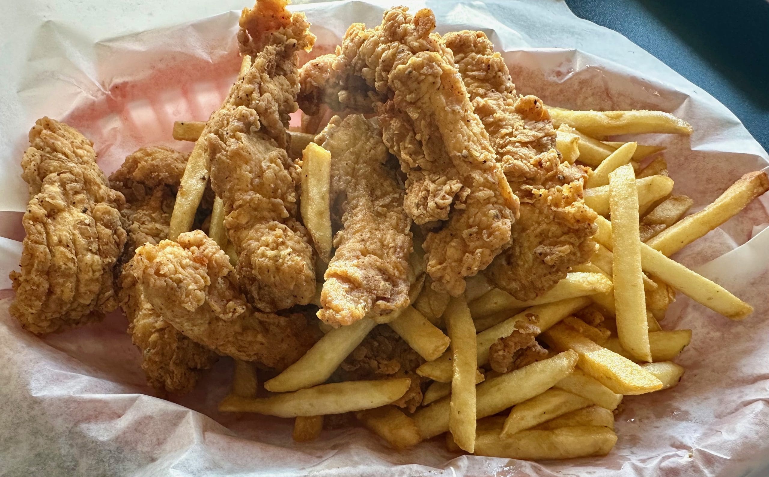 13 July 2024: In 2023 and 2024, it seems every chain restaurant serving chicken fingers has established a presence in the City of Vision. We have yet to (and likely never will) frequent any of those chains. Instead, we’ll visit mom-and-pop restaurants for our chicken fix. Even if assertively sauced and well seasoned foods aren’t your thing, K’Lynn’s has something for you. For my Kim, that’s fried chicken fingers served with a mound of French fries. Though somewhat generously battered, the chicken bespeaks of Southern deliciousness.