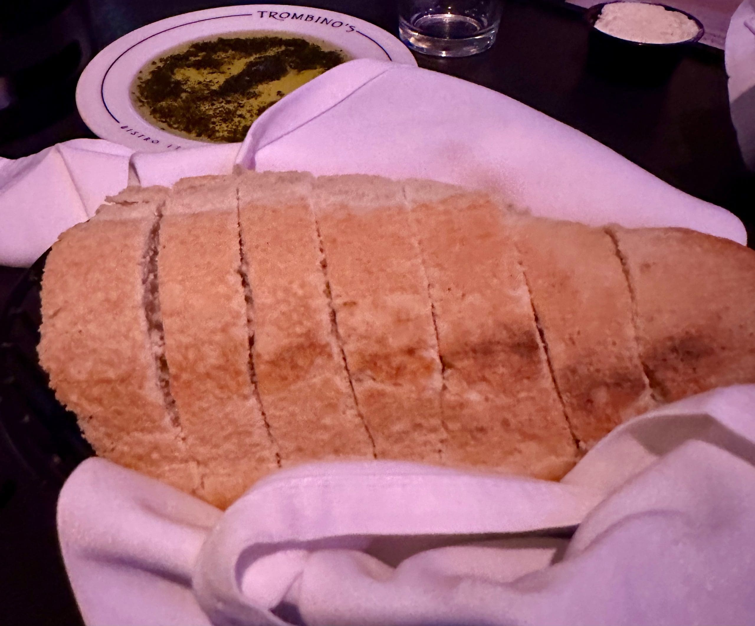 As you peruse the menu, your server will ferry over a basket of warm bread covered by a cloth to keep it fresh and warm. It’s among the best restaurant bread in town and it’s made from scratch, from a Trombino aunt’s bread recipe. Accompanying the bread are pats of butter (the easy-to-spread kind not the half frozen stuff) and a dipping sauce blending salt, pepper, oregano and other Italian seasonings in an olive oil base. It’s a peppery sauce with plenty of personality. Visit Trombino’s when famished and you risk filling up on the addictive bread.