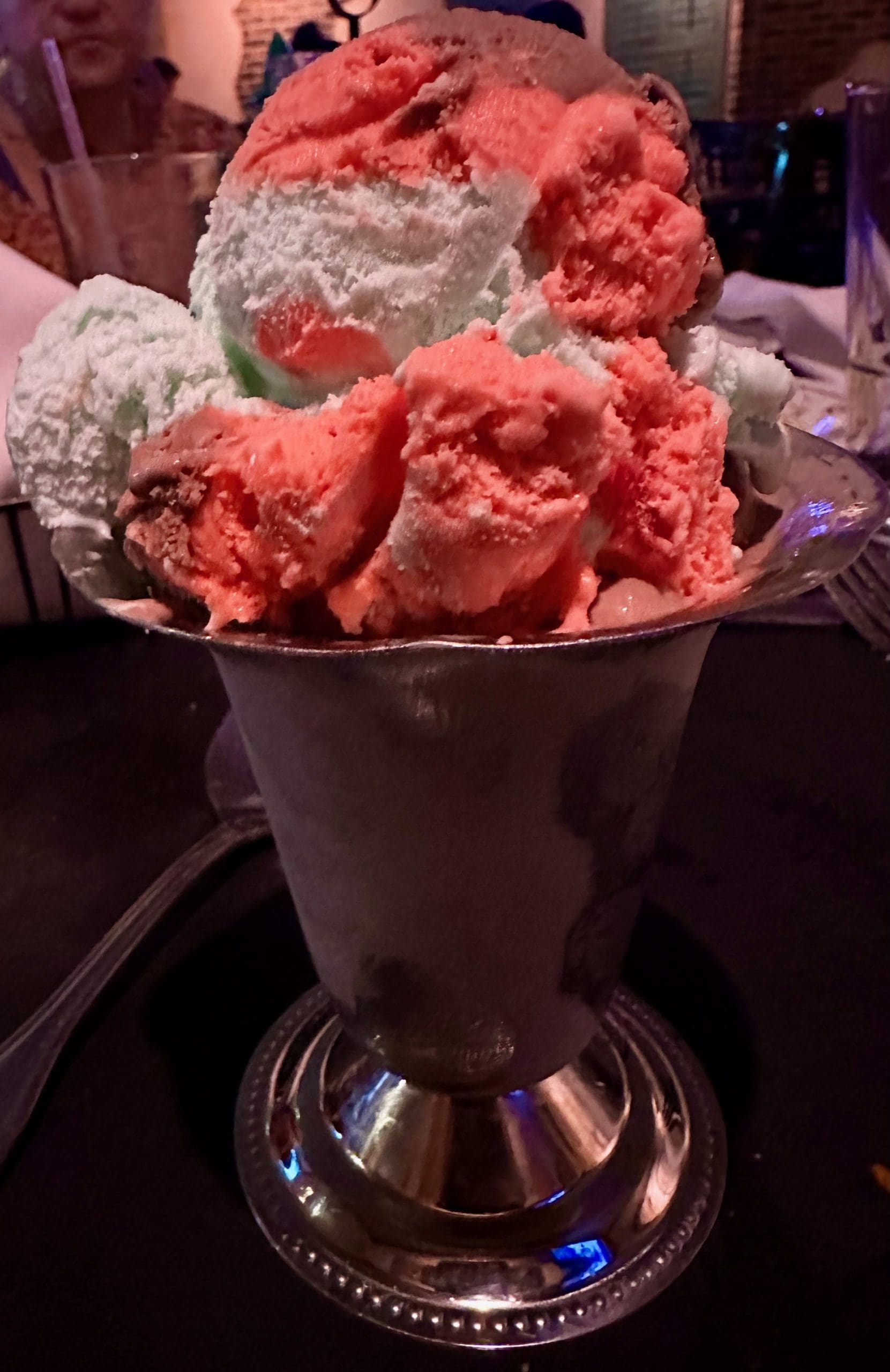 27 July 2024: Culinary historians believe spumoni originated in Naples sometime in the 19th century. Ironically, Naples is also the birthplace of Neapolitan ice cream. Like Neapolitan ice cream, spumoni is a tri-colored melange of flavors: chocolate, cherry and pistachio. While Neapolitan ice cream is always brown (chocolate), pink (strawberry), and white (vanilla), spumoni is typically brown, pink, and green. Spumoni is a traditional Italian dessert that’s actually a milk sherbet–not quite ice cream and not quite sorbet. Dairy (usually milk or buttermilk) is added. This gives it a slightly creamier texture than sorbet, as well as a lighter, pastel color. Trombino’s spumoni is fabulous!