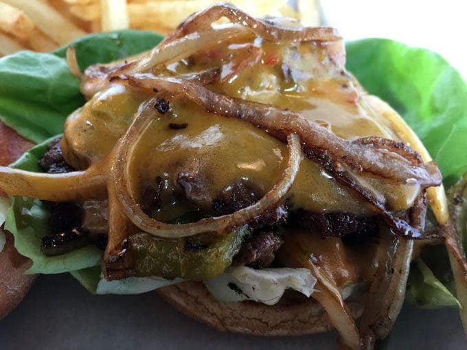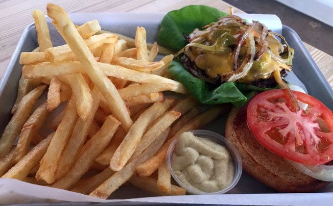 Much as he loved the fries, it was the burger which excited Ryan most. Pete’s boasts of premium, all-natural New Mexican beef with no hormones and antibiotics. Best of all, the proprietary blend with a beauteous balance of fat and lean is ground daily on the premises. Complimentary toppings include lettuce, onion and tomato, but for a pittance you can add Cheddar or American cheese and (or) green chile. Each burger is prepared “smash style” which means the beef is mashed onto the grill, a process which often leads to desiccated burgers. Not so at Pete’s Frites where each burger is a multi-napkin, chin-drenching affair. Bun integrity goes out the window if you order a double patty burger which is “release the floodgates” juicy. Four-ounces of beef make up a single patty burger.