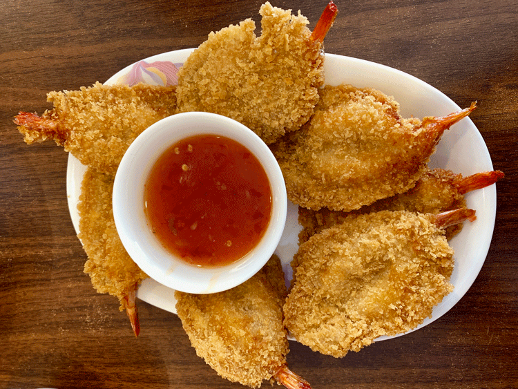The notion of ever again having fried, breaded shrimp seemed as likely as me rooting for the despicable New York Giants until my Kim espied tempura prawns on the appetizer menu. It had been decades since my lips wrapped themselves around shrimp that hadn’t been boiled, grilled or even “cooked” with citrus juices (ceviche). At the very least, the tempura prawns were several orders of magnitude better than any shrimp bearing the label Mrs. Paul’s or Gorton’s. Not only were these enormous prawns not an oxymoron of the term “giant shrimp,” they had a sweet, briny delicious quality and the tempura sheathe didn’t create a bready aftertaste. Alas, the overly sweet plum sauce proved unworthy of the butterflied prawns. Better was the fish sauce. Best would have been Uncle Fred’s cocktail sauce.
