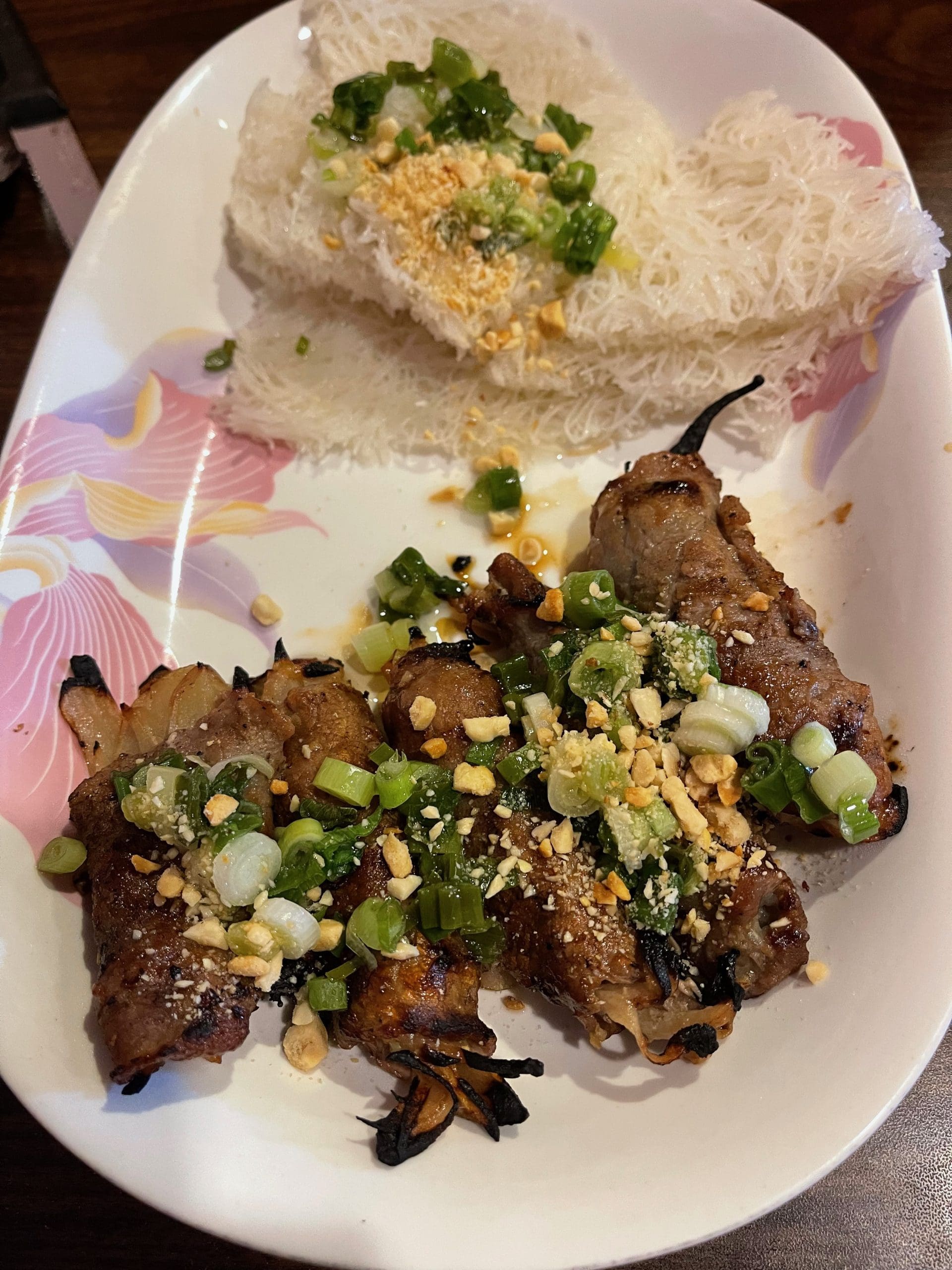 8 February 2023: Very much a “beefaholic,” my Kim’s very favorite entree, found in the “salted dishes” portion of the menu, is grilled onion beef, an order of which features six cigar-shaped “beef rolls” encasing slightly caramelized grilled white onions then topped with ground peanuts and diced green onion. Every bite is like an adventure in culinary flawlessness with tastes that awaken and tantalize your taste buds. The beef rolls are thin (but not carpaccio thin) and have a more than subtle smoky sweet fragrance. You can eat these sans fish sauce or with fish sauce. They’re terrific either way. Best, as with all grilled items on the menu, your chosen protein doesn’t hit the grill until your order is placed, ensuring optimum freshness and flavor.