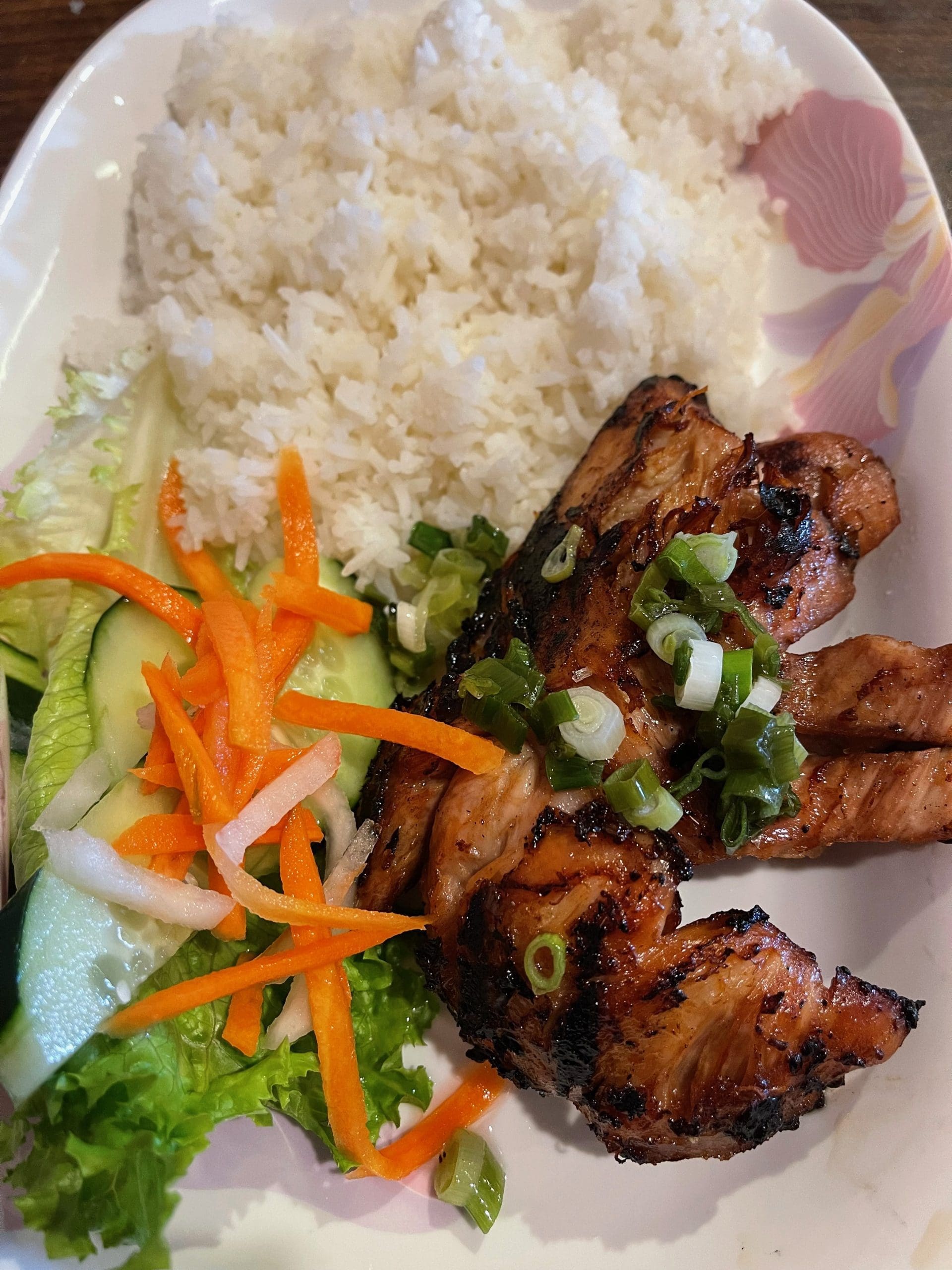Saigon 2 offers lemongrass chicken with rice or with noodles and a side of fish sauce. The dish contains a single chicken thigh with an almost glazed and charred spatchcocked appearance, several “fingers” jutting out from the thigh. As with all grilled dishes on the menu, the thigh doesn’t touch the grill until an order is placed. The grilling process imparts a nice caramelization that seals in moistness and the flavor of a sweet, savory, tangy marinade of lemon juice, ginger, garlic, fish sauce and of course, chopped lemongrass. It’s a wonderful marinade that gives the moist, tender chicken wonderful and diverse flavor notes.