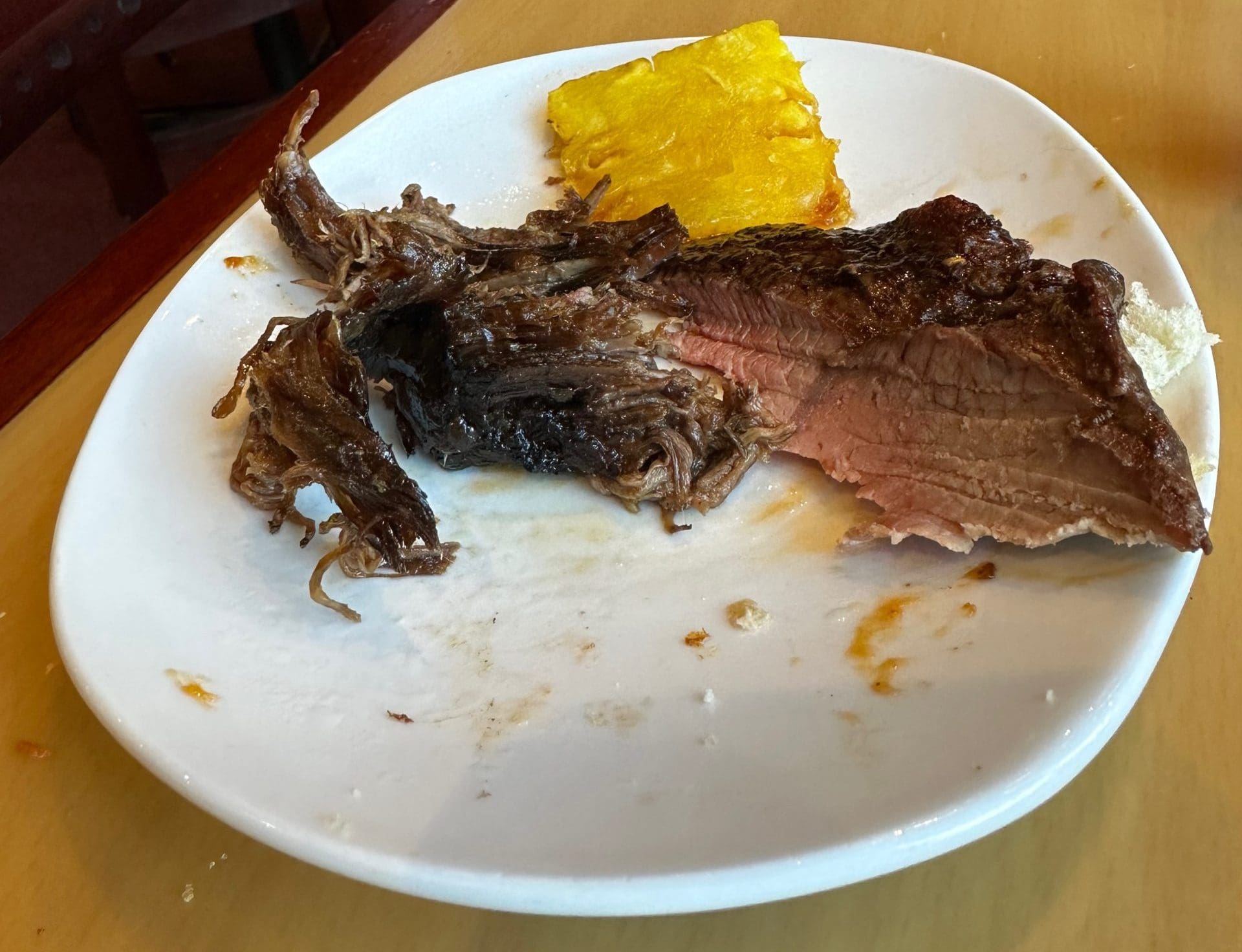 The fraldinha (beef tender) is a cut of beef made up of part flank, part short loin, and part bottom sirloin. This beef cut is long and thin and is full of connective tissue and replete with marbling. That’s the reason meat is traditionally cut against the grain before it’s grilled. The caramelized edges were my favorite. The asado (marinated beef brisket) is presented as tendrils of beef with plenty of “bark.” You can’t beat abacaxi (grilled pineapple) as a palate cleanser in between all those meats. Grilling pineapple seems to bring out the complex sugars and flavors of pineapple.