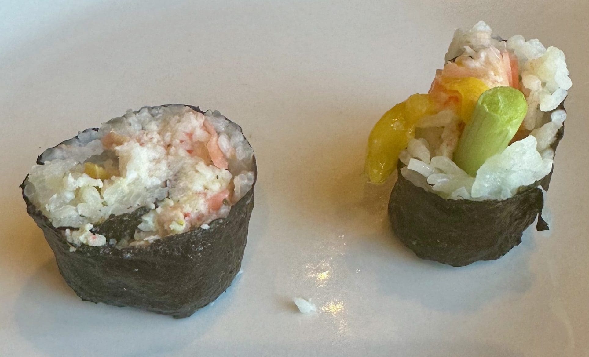 There were two items on the salad festival I couldn’t resist trying: lobster bisque and sushi. I wasn’t necessarily craving either, but was curious as to whether they could possibly be good. The lobster bisque was a bit of a surprise. Expecting a salt bomb as you’d get from a can of Campbell’s soup, the lobster bisque is better than some I’ve had–even in New England (remember, I lived in the Boston area for two years). It was creamy and quite good though I didn’t discern any of the characteristic bits of lobster that make a good lobster bisque. The sushi was better than grocery store sushi, but not nearly as good as restaurant quality sushi.