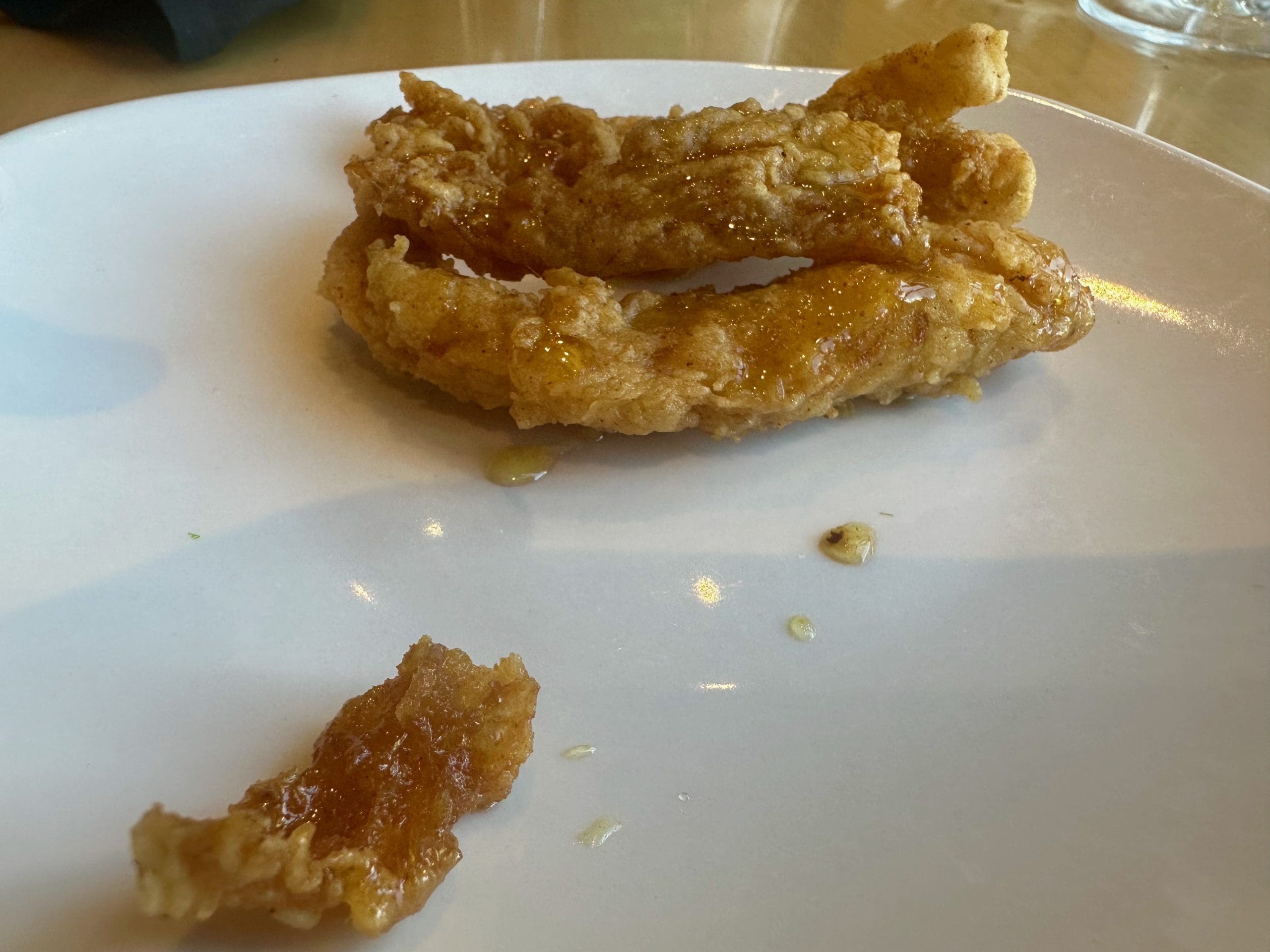 First to our table was a fusillade of meats: frango com parmesão (parmesan chicken). Parmesan is applied conservatively to give the chicken hints of light sharpness and nutty flavor. More assertive was the fringe picante (sweet and spicy chicken thigh) whose heat is discernible even to a volcano-eater like me. My favorite of the three (this won’t surprise you) is the coração de frango (Brazilian chicken hearts), bite-sized dark meat hearts with a slightly metallic, gamey flavor. Not pictured (probably because I devoured it quickly) is the Picanha (top sirloin). It’s the most popular cut of meat on the Churrasco and as good a steak as you’ll find at some chophouses.