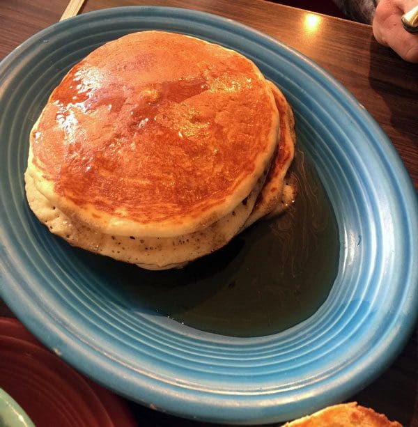 15 December 2016: A long time ago, culinary gods must have decreed that all family restaurants, cafes and diners across the fruited plain are required to serve pancakes. Not just any pancakes. Those gods created a blueprint for pancakes that are much better than any of us can make at home–gigantic, fluffy, delicious orbs beckoning for butter and signaling for syrup. Mannie’s has that blueprint down pat! A short stack of two pancakes (pictured below) is as tall as the Tricentennial Towers on the I-40 corridor outside Old Town. Two are easily large enough to share while three will make a very filling and satisfying meal for one.