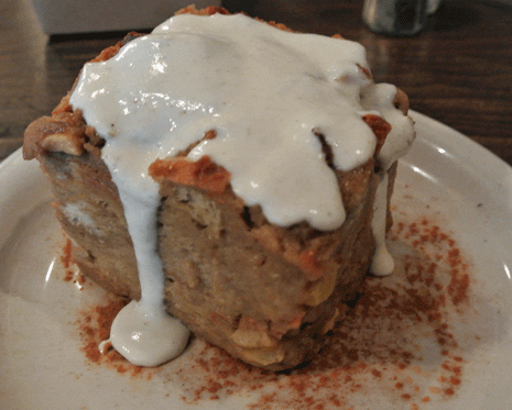 17 November 2012: Five homemade sweets are available with which to finish a grand meal. The bread pudding, made with Bailey’s Irish Cream and Jameson whiskey sauce is roughly the size of a small meatloaf. It’s big enough for a family of four to share, but so good the most you might want to do is give your dining companions a small spoonful so they can see for themselves how good it is. Unlike so many bread puddings this dense, this one is very moist, courteously of the apple slices and sultanas baked right in. The Jameson whiskey sauce lends its distinctively smooth characteristics. Larry McGoldrick, the professor with the perspicacious palate, likes this bread pudding enough to place it on his bread pudding hall of fame. It’s well worthy!
