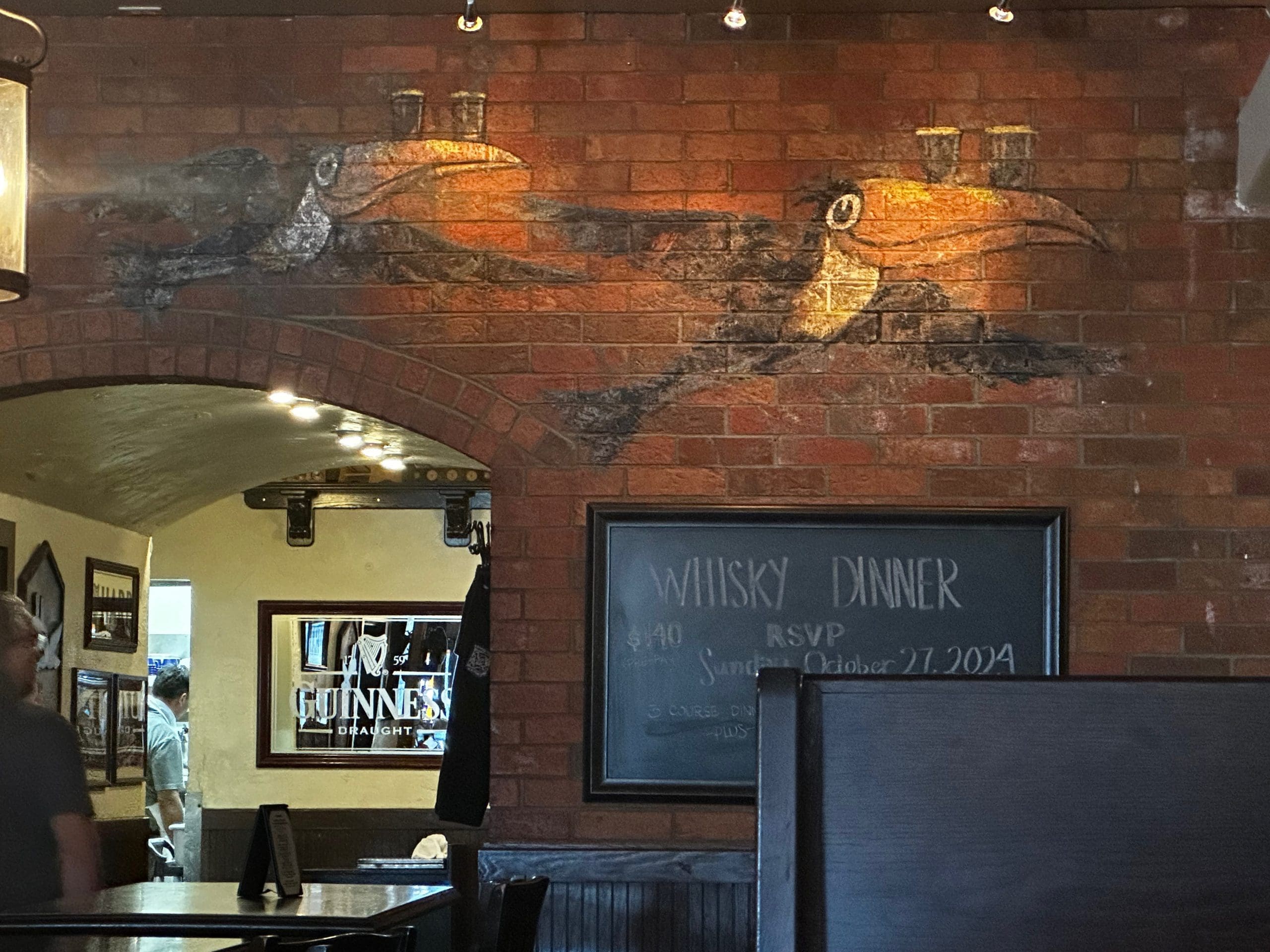Adult libations include Guinness, the world-famous Irish beer brewed since 1759. At only ten calories per ounce, Guinness (which claims to have bottled the craic) is the favorite beer of the Emerald Isle. Also available are beers brewed in New Mexico, Mexico, England, Oregon, Holland and Ireland. On the north wall are depicted four magpies. Two pictured far up top are reminiscent of Heckle and Jeckle, two animated cartoon characters renowned for their wisecracking. These magpies are among several anthropomorphic characters used by Guinness.