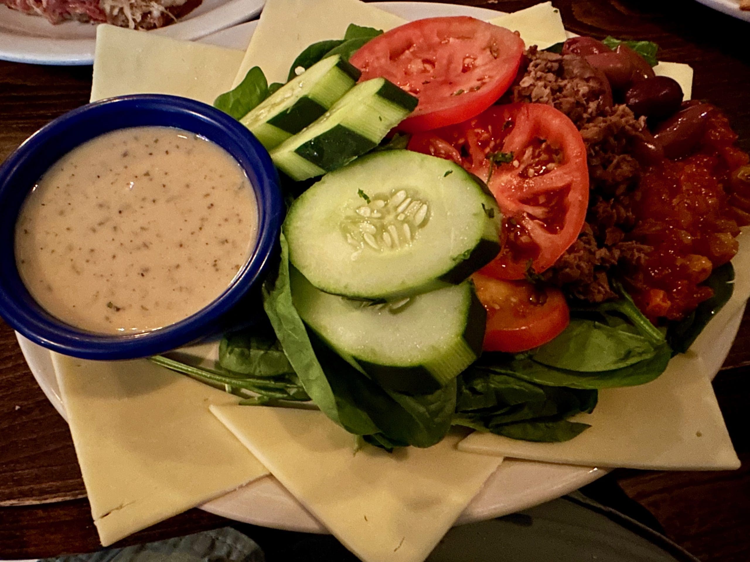 Two Fools Tavern is rather on the dark side (not that having enough light helps the quality of my photos). We saw the wait staff ferry plates brimming with food to several tables, but couldn’t discern what was on those plates.