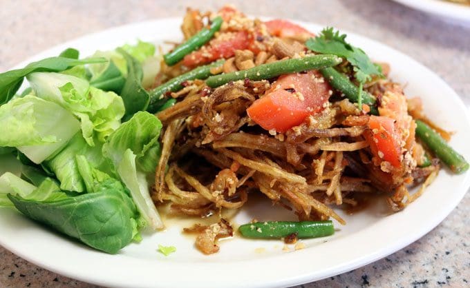 17 December 2016: Since first experiencing the transcendent papaya salad at An Hy Quan, Albuquerque’s premier Vietnamese vegetarian restaurant until its closure several years ago, we’ve craved the deeply satisfying balance of flavors in that dish. We often wondered if those flavors translated well to the frying process. Leave it to Thai Heritage to answer that deeply existential question for us. Yes, the menu does include a Fried Papaya Salad. Fried very lightly, a passel of shredded papaya is indeed infused with the flavors we love in its fresh counterpart—piquancy from Thai chilies, pungency from fish sauce, sweetness from sugar, savory notes from garlic and sour notes from lime juice. Sprinkled with finely crushed peanuts and garnished with sliced tomatoes and green beans, it’s a very enjoyable starter.