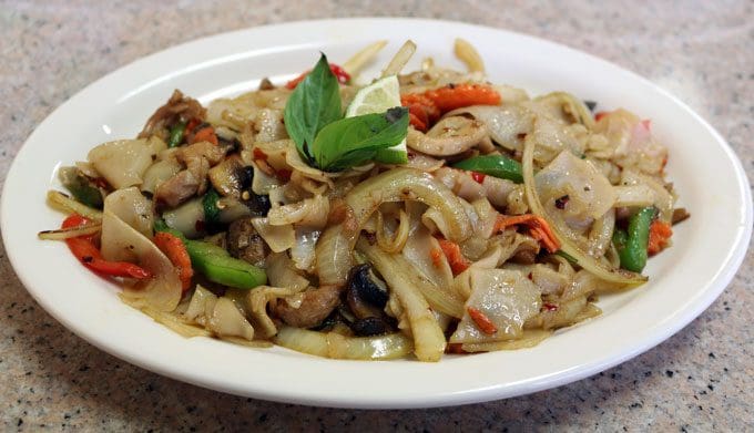 Issan dishes are still strewn throughout the menu including two salad dishes Thai food aficionados will recognize: larb (chopped chicken, mint, basil and red onions dressed with lime juice and ground red chilies) and papaya salad (shredded papaya mixed with garlic, lime juice, chilies, tomatoes and ground peanuts). It’s certainly a menu that deserves serious exploration. Your explorations will reveal several dishes—such as orange chicken and pineapple fried rice–more closely associated with Chinese restaurants than with Thai eateries. You’ll find that noodle dishes outnumber rice dishes by a wide margin. You’ll delight in seeing eight desserts on the menu, more than at just about any other Thai restaurant in town. Alas, there are only four curry dishes including a tempting pumpkin curry. Nonetheless, this is a menu in which even those of us who’ve tried everything (or think we have) will find something new.
