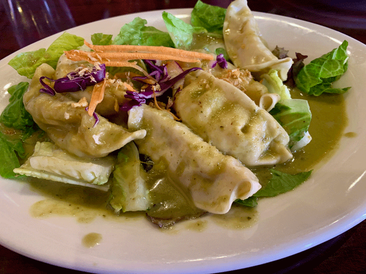 12 April 2019: Curry cravings can be assuaged early at Thai Heritage with an order of the restaurant’s fabulous steamed curry dumplings (six crescent-shaped vegetarian dumplings in a green curry sauce). It’s an idea whose time has come. Not only can you luxuriate in the rich, deeply satisfying and nuanced flavor of green curry, you’re spared the monotony of any sort of dipping sauce. Pay close attention to the complex flavors of the curry and you’ll agree there’s more flavor there than you’d find in five dipping sauces. The dumplings are light and delicate though you’ll certainly want more than six.
