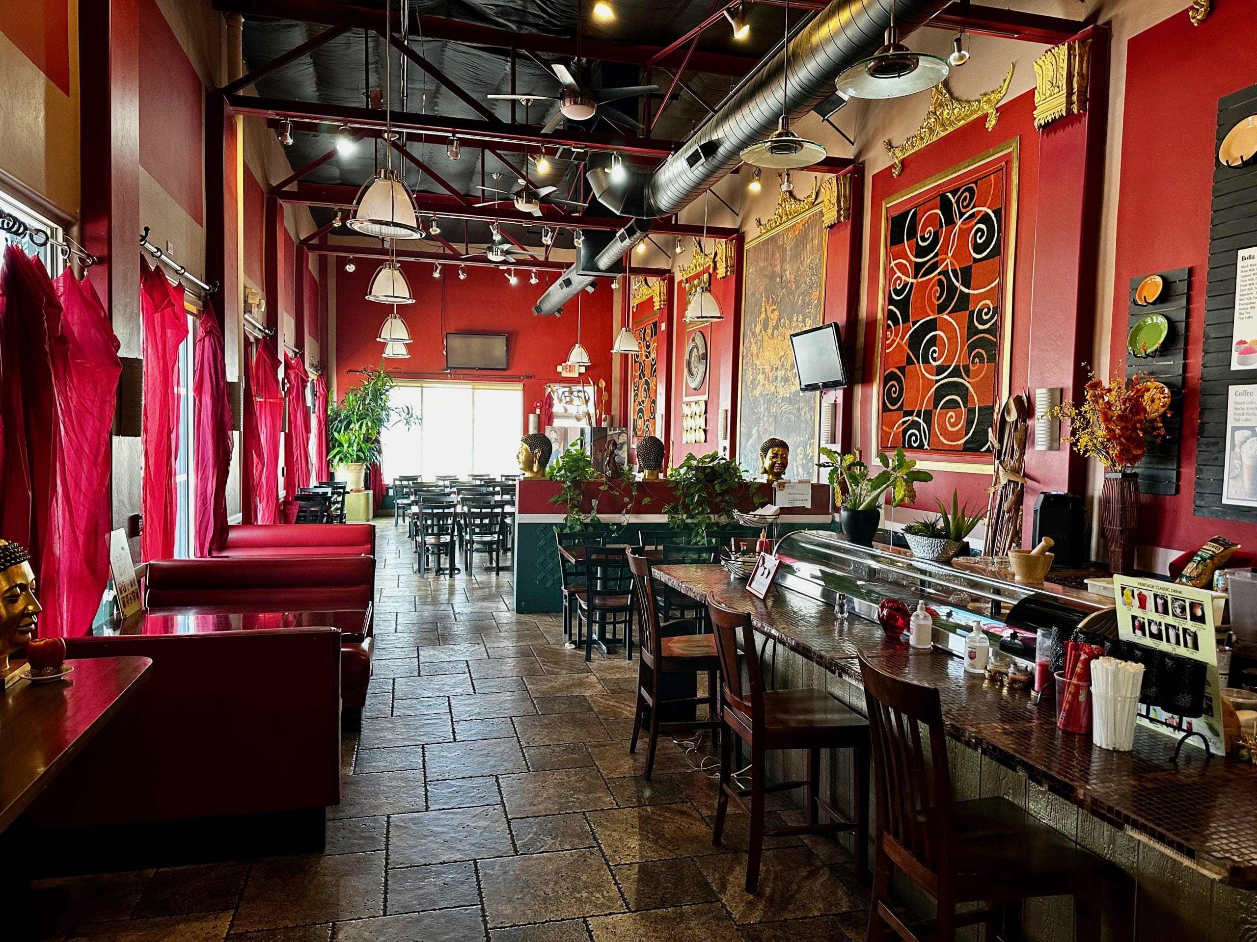 A delightful restaurant, thanks for the tip. That spicy noodle dish was vibrant, with the vegetables crisp and delicious. Dessert? In a Thai place? Oh yeah — fried banana with ice cream. Terrific friendly service in a clean well-lighted place. The music videos were a hoot. We’ll be back soon to begin working through the menu.