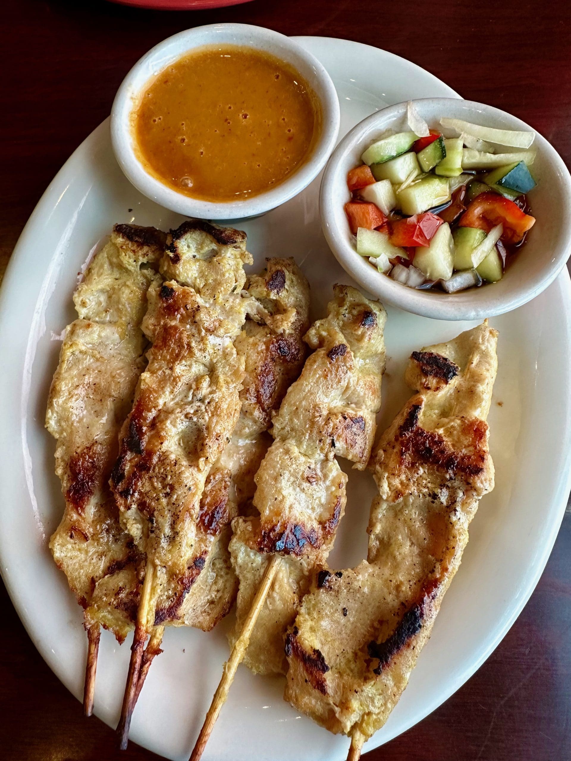 26 January 2024: My friend and publicist Bob of the Village of Los Ranchos and I marveled that at eighteen years of age his granddaughter Bailey traveled to Thailand. We both agreed neither of us would have had the courage to embark on such an adventure until our 20s. Suffice to say Bailey is more conversant in Thai culture and cuisine than either Bob or I. That’s especially true of Thai street food, among the most popular of which is satay (small pieces of meat grilled on a skewer and served with a cucumber salad and peanut sauce). The chicken satay at Thai Heritage & Vegan is available with soy chicken or the real thing. Neither of us is enlightened enough to order the soy version of chicken. The “real” chicken is a bit on the dry side, but has a pronounced grilled flavor. Both sauces were very nice.