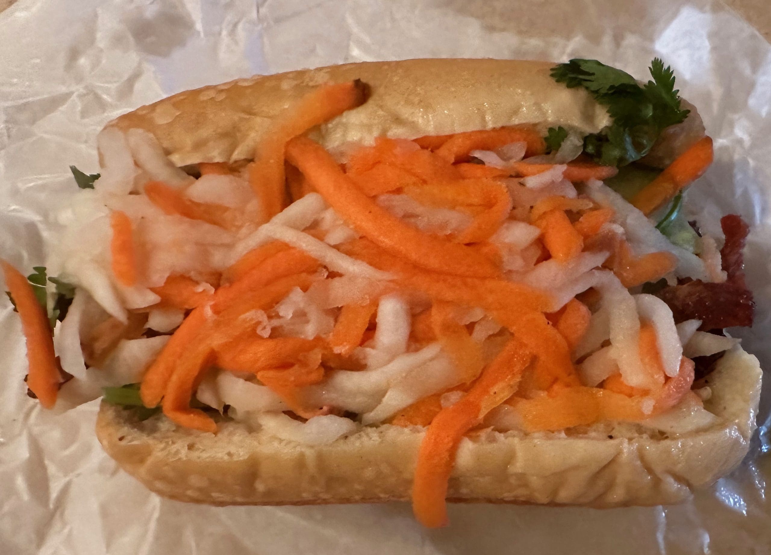 7 July 2007: Another appetizer option is Banh Mi, known in some American circles as a Vietnamese sandwich. Viet Taste offers several sandwich options: grilled pork, chicken or beef as well as a beef stew sandwich. Each sandwich is served on a toasted baguette, a bread first introduced by the French when they colonized Vietnam as a part of French Indochina. Long before the build back better economy, a Vietnamese restaurant owner told me bahn mi should always be one foot long and cost no more than five dollars. At Viet Taste, those days are long gone–at least in terms of size. While the banh mi did cost five dollars, it may not have been even five inches in size. At least it was stuffed.