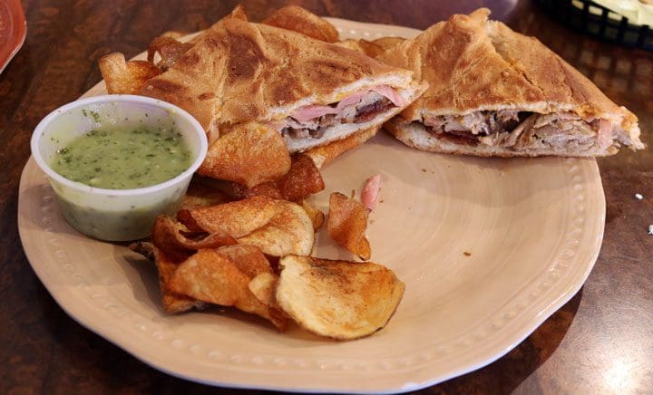 2 January 2017: While there isn’t a protein Dennis can’t make interpret into its self-actualized best, one of his favorites has long been duck. Duck enchiladas, you might recall, is one of the dishes with which he wowed Food Network glitterati Guy Fierri. When my Kim saw Duck Cubano on the Tortas menu, she couldn’t wait to see what delicious liberties Dennis would take with the traditional Cuban sandwich. True to form, the pressed sandwich was stuffed with roast beef, ham and cheese but it also had bacon and instead of yellow mustard, it was constructed with pickled mustard seeds and spicy mayo. To say it’s one of the tastiest Cubanos we’ve ever had is an understatement. There’s deliciousness in every morsel. The duck is plentiful, rich and delicious with nary a hint of sinew or excess fat. The Cubano is served with a side of housemade chips and a tangy tomatillo-avocado dressing.