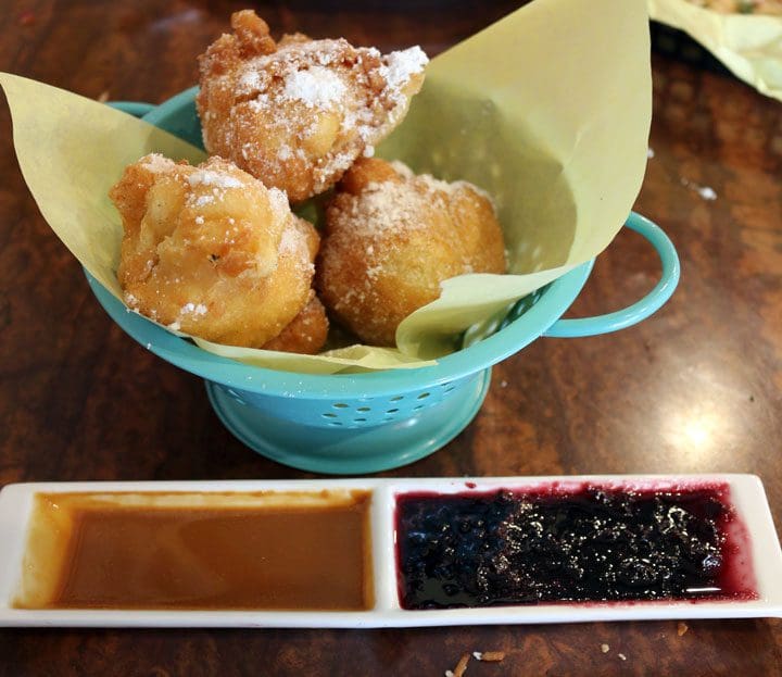 5 January 2017: Maya is open seven days a week. From Monday through Saturday doors open at 11AM and close at 10PM. Featured fare on Sundays (10AM – 2PM) is brunch, long a staple of Eli’s Place…and if you’ve frequented Dennis’s flagship restaurant, your mouth is probably salivating at the prospect of pancakes. No one in New Mexico makes pancakes quite as good as Dennis’s masterpiece orbs. Whether it’s blue corn, lemon-ricotta or pumpkin, he’s a true griddle master. It surprised me to hear that in the three months Maya has been open, only a couple orders of pancakes have sold. Dennis will soon be introducing Dutch Boy-style pancakes (though they’ll have a more apropos name). The sample he gave us was terrific with a sprinkling of confectioner’s sugar and a tangy cherry compote on top.