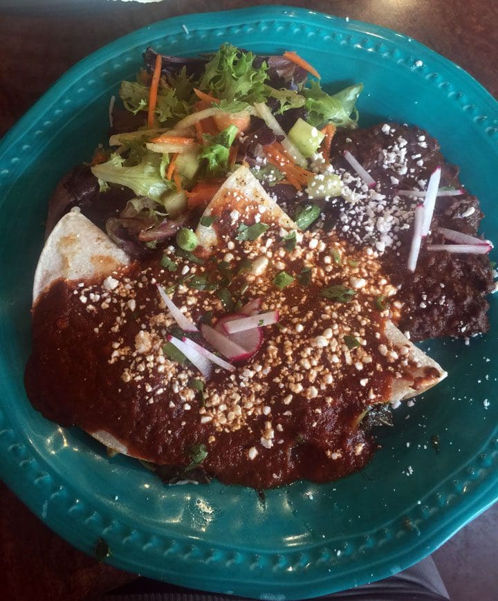 2 January 2017: Of course that could be said about the other daily special, Guajillo-Pecan Mole Chilaquiles. When Dennis makes mole, you’re well advised to order it. His mole has a profound earthiness and a discernible depth of complex flavors working together very harmoniously. The use of guajillo bespeaks of the authenticity he pursues in his cooking. Guajillo, the dried form of the mirasol chile, is a mild, slightly sweet chile with notes of berries and tea. It’s an excellent basis for mole with which he covers tortilla chips. As you enjoy the mole, you’ll find it’s been garnished with finely chopped pineapple, cobija cheese, shaved radishes and more, all of which combine to give you different flavor profiles in every bite. This mole dish is served with papitas and the best refried black beans we’ve had. This is a mole worthy of Oaxaca.