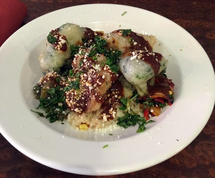 2 January 2017: As we mulled what entrees to order (knowing they would all be fabulous), we asked Dennis for advice. He recommended either of the specials. Both sounded so good we couldn’t select just one. First to hit our table was a Burrito Ahogado which translates to smothered or drowned burrito. It’s unlike any burrito we’ve had at any of Dennis’s other restaurants. Though vegetarian, it’s a burrito carnivores will love, too. The burrito is engorged with collard greens and corn swimming in a spicy tomato broth with a garnish of pickled carrots and red onions and a sprinkling of cobija cheese. My Kim, who’s never been a fan of collard greens, absolutely loved these. The spicy tomato broth will tantalize your taste buds with a pleasant piquancy and nice acidity. This is one special which should be on the daily menu.