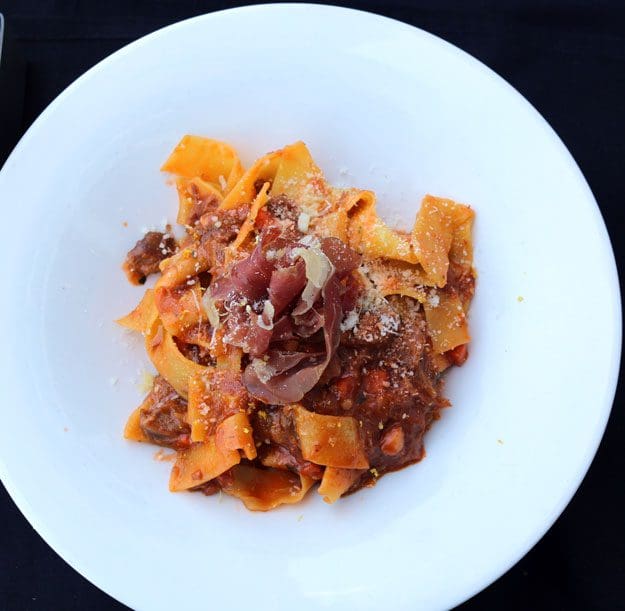 The Summer, 2018 menu introduced another fabulous Pappardelle option. Seeing Pork Cheek Pappardelle (braised Duroc pork cheek, market pancetta, prosciutto crudo, roasted carrots, handmade Pappardelle on a savory braising sauce) on the menu put an immediate stop to my perusal of a superb menu replete with temptation. Pork cheek (guanciale in Italian) comes from the jowl of the pig, one of my favorite cuts of pork, albeit one not that commonly offered. It’s a robustly flavored and deliciously fatty pork that stars on any dish in which it’s a part. Though it may be the named pork on the dish, it shares space on the plate with two other fabulous in their own right Italian pork staples, pancetta and prosciutto, a terrific triumvirate unmatched on any dish anywhere in the Albuquerque area. The stew-like savory braising sauce and carrots did evoke a slightly wintry feeling on a 100-degree-plus day in which it was much needed.