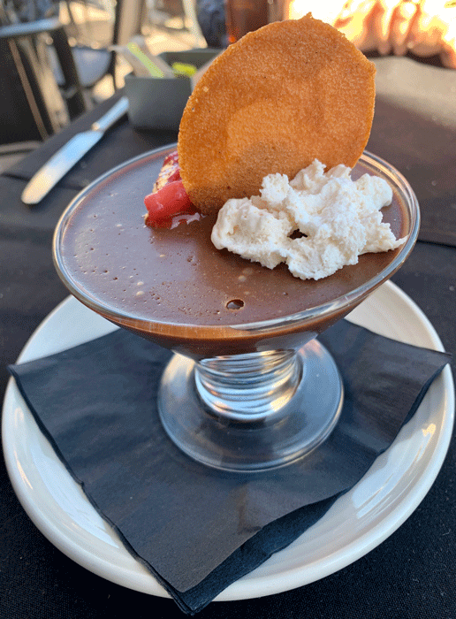 When we espied chocolate budino on M’tucci’s winter dessert menu, there was no reason to read further. Resembling a chocolate brown skating pond in a brandy snifter glass with a small dollop of macerated strawberries and a basil shrub whip flanking a brandy vanilla tuile, it was almost too pretty to eat. Almost! This is no instant, pre-packaged Jello product. Though significantly thicker than most American pudding, it’s still light, airy and smooth. Moreover it’s much more intensely flavored. That meant intense chocolate. The longer strawberries are macerated, the more intense and rich their flavor. This truly was a truly intense, truly flavorful and absolutely wonderful dessert.