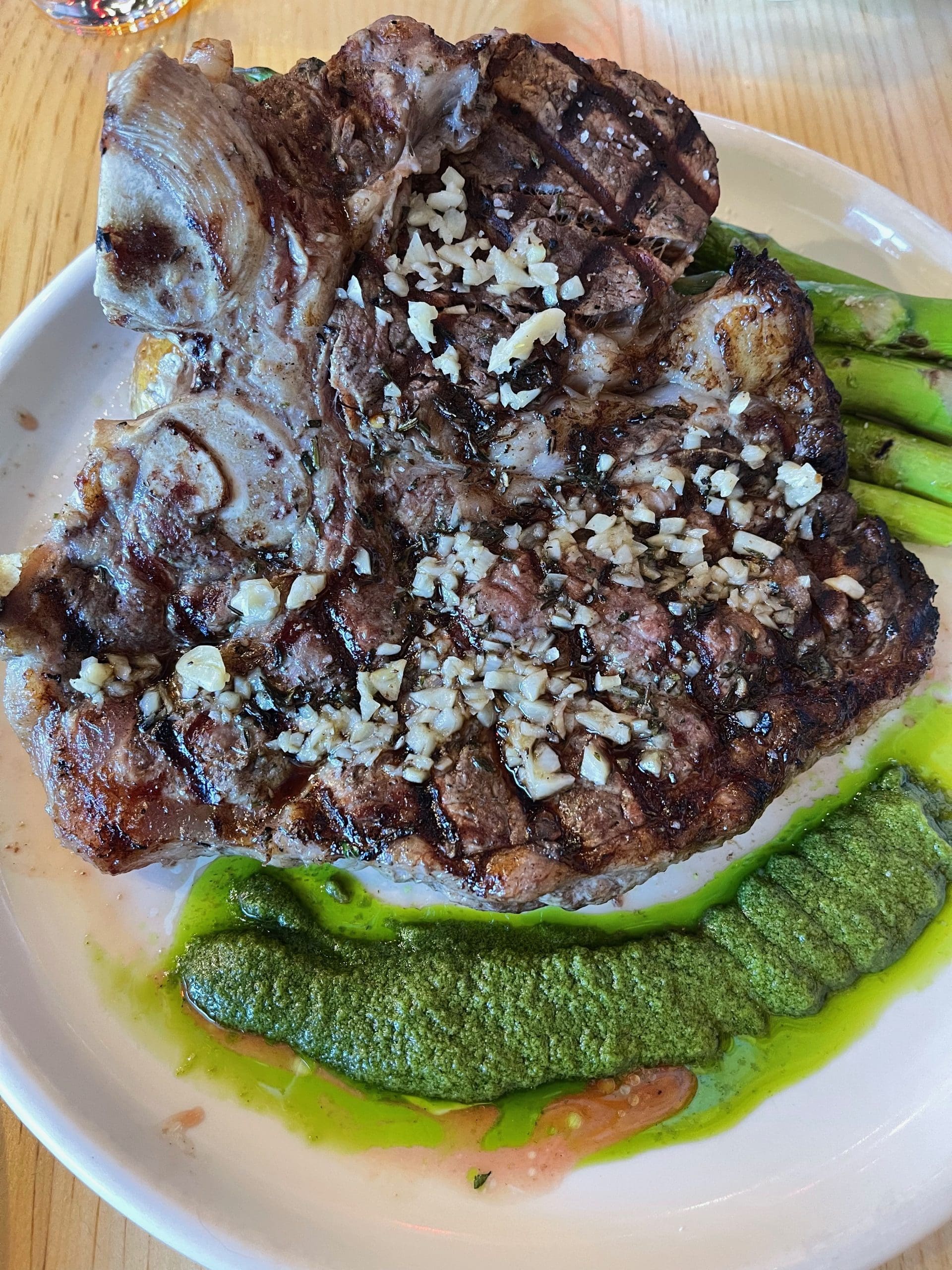 She emphasized that a Porterhouse has the best of both worlds: a Beef Tenderloin (Filet Mignon) on one side and the N.Y. Strip on the other side of the bone. Yawn, the story is better. M’tucci’s meaty mammoth is admittedly delicious (my Kim could afford to share a few of the 24-ounces)–grilled to her exacting “medium” degree of doneness though with too many grill marks to suit me. Prolific author and barbecue legend “Meathead” Goldwyn used science to develop a case against admittedly beautiful grill marks: “I see lost potential when I see grill marks on meat: You want it all brown.” My Kim isn’t sold. “You order it without grill marks!” she stressed. The Porterhouse was served with a traditional Italian salsa verde, crispy saltwater potatoes and grilled asparagus. Despite my predilection for small portions of grill mark-free steak, this is one I might have finished.