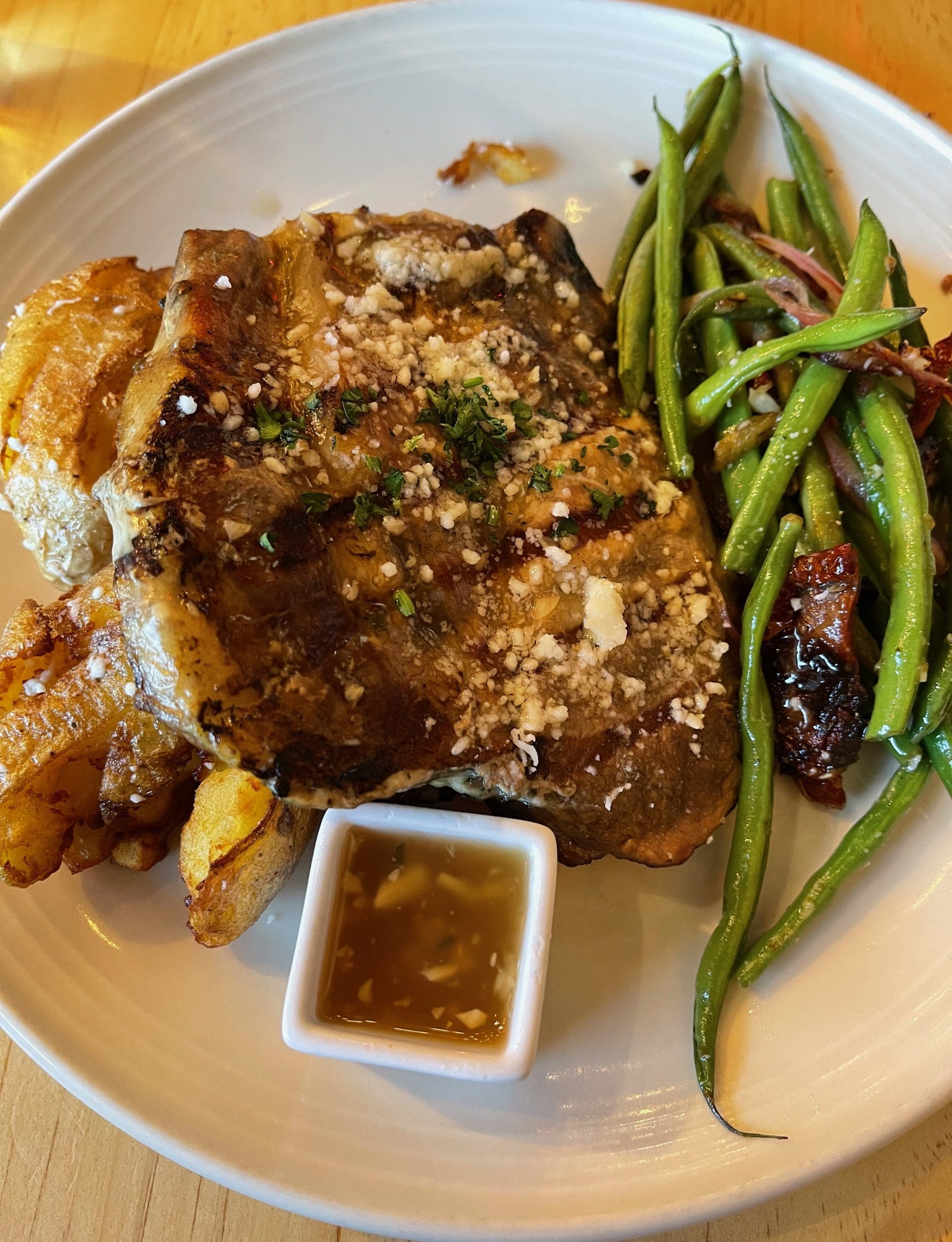 12 March 2022: Once while ordering a cheeseburger from a new restaurant, a server asked Southern humorist Lewis Grizzard “Do you want a plain cheeseburger or one of our specialties?” Grizzard’s retort was “A pork chop is a pork chop and a cheeseburger is a cheeseburger.” Hmm, I wonder if he’d consider M’tucci Moderno’s Pork Chop Ripiendo “just a pork chop.” Pork Chop Ripieno was inspired by a meal in Tuscany M’tucci executive chef John Haas experienced in 2019. He takes a Sackett Farms sourced pork chop and stuffs it with Prosciutto, Colonnata butter (also inspired by the 2019 Italy trip), fresh sage, Italian Asiago and mozzarella served with a Marsala reduction along with roasted Garlic polenta and young haricot vert. It is indeed an inspired dish, the work of genius (though I requested saltwater potatoes instead of polenta).