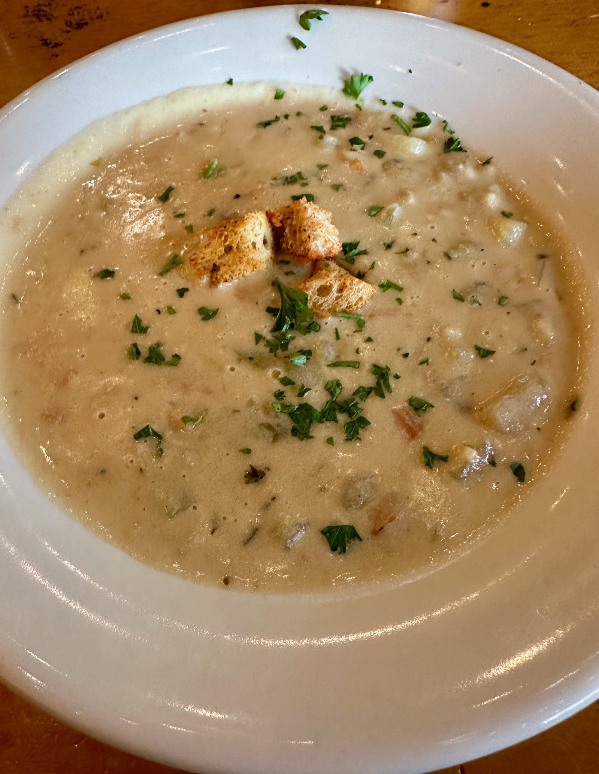 24 January 2024: American author Joseph C. Lincoln once wrote: “New England clam chowder, made as it should be, is a dish to preach about, to chant praises and sing hymns and burn incense before. […] It is as American as the Stars and Stripes, as patriotic as the national Anthem. It is Yankee Doodle in a kettle.” The key here is “made as it should be.” It could be argued that in landlocked New Mexico, it’s not possible to make good New England clam chowder because we don’t have access to off-the-boat clams. I would argue that New Mexican restaurants–including M’Tucci’s Moderno–do make good New England clam chowder. Good, not necessarily great. Among the “good” qualities is being served hot, being creamy and being a comforting elixir, especially on a cold day. Watch out for the croutons which pack a peppery punch.