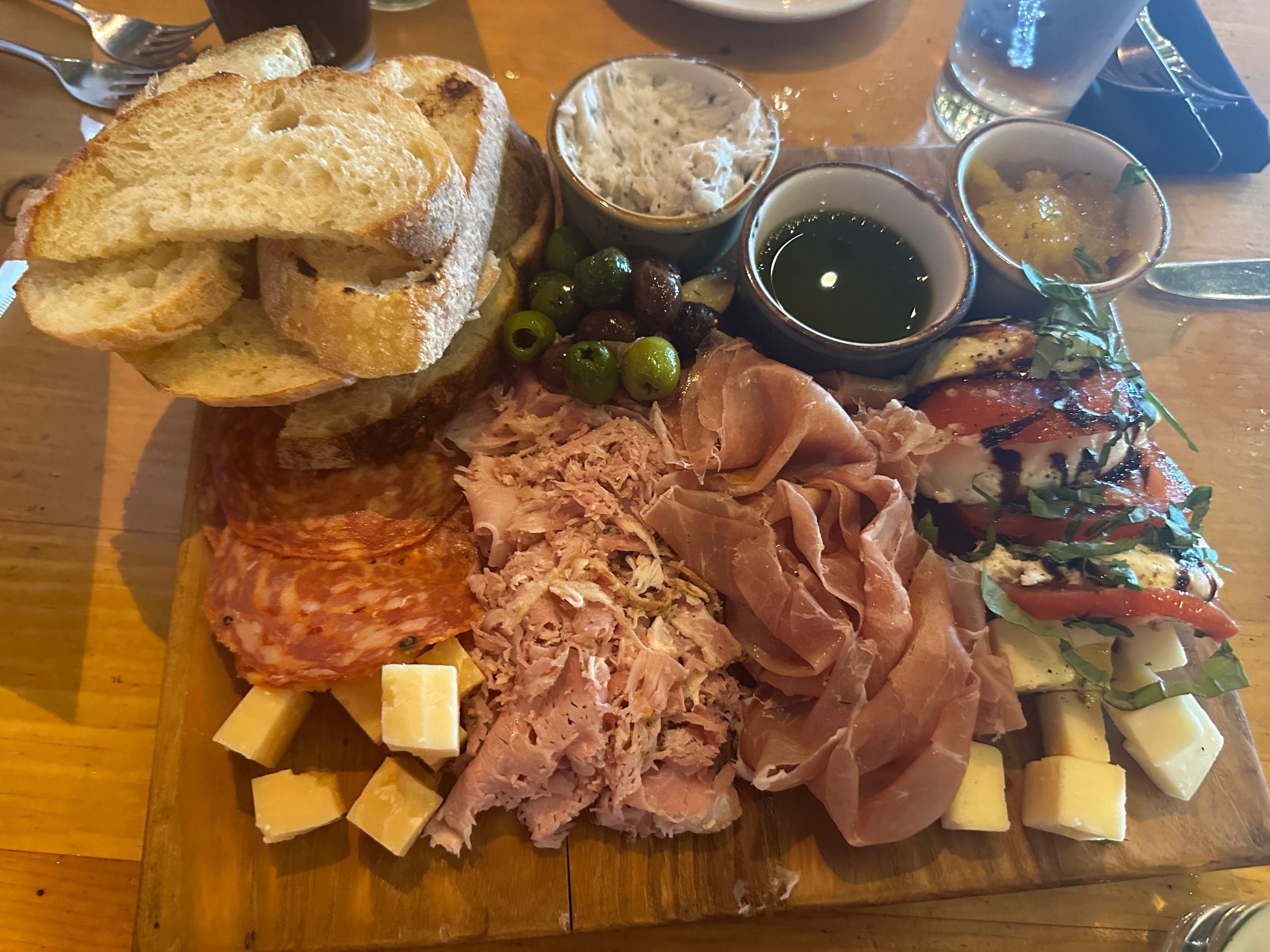 29 July 2024: Imagine our delight when we visited M’Tucci’s Moderno on a Monday evening and discovered the special of the day was a heavily discounted M’Tucci’s Family Board (Italian prosciutto, Calabrian salami, Italian style ham, Tucumcari smoked gouda, Italian baby Parmesan, house Colonnata butter, fresh Mozzarella, herb and garlic Italian roasted olives, smoked shrub jam, basil marinated tomatoes and bread). Normally priced at $25, it was available for $15, a steal. The Family Board serves four to six guests. Fortunately we were joined by brother-in-law Tim and his bride Lola. Virtually every item on this board is a highlight, but among our favorites were the smoked shrub jam which has the concentrated intensity of the fruit from which M’Tucci’s shrub beverages are made and the tartness found in a shrub. Unanimous acclaim was bestowed upon the colonnata butter which might be more accurately called a “lardo.” Made from pork lard then seasoned and aged, it’s ounce per ounce it is lower in cholesterol than butter and has fewer calories than olive oil. It’s also quite delicious on M’Tucci’s bread.