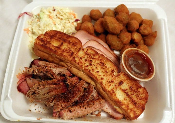 10 March 2017: Even better than the two meat dinner is the three meat dinner. The pulled pork is blessed with a dry rub comprised of salt, pepper and other spices rubbed liberally on the pork. Both the ham and turkey are sliced thinly and are imbued with a light smoke. As with all of Danny’s meats, absolutely no sauce is needed though that sauce is so good you’ll want to drink it up. Worthy accompaniment to the three meats is the coleslaw, a sweet-tangy mound light on creaminess but big on flavor and crispness. Also terrific is the fried okra.