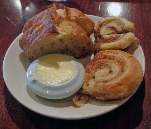 4 August 2014 (Brunch): Lest I forget, the complementary basket of bread is among the city’s best. I believe the bread is made by Albuquerque’s Fano Bakery, one of the very best bread-making companies in the state and a purveyor of artisan style rustic and specialty breads. It’s the type of bread you could eat by the loaf–with or without butter. The butter served at Zinc is soft and smooth for easy spreading. During Saturday and Sunday brunch, the bread plate may include croissants and scones. The wait staff will replenish them happily.
