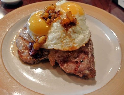 4 August 2014 (Brunch): Another breakfast standard which never seems to fall out of fashion is grilled pork chops, a solid and unspectacular (translation: boring) offering. It’s usually up to whatever accompanies those “supporting cast” pork chops to enliven breakfast. The yang to the grilled breakfast port chop’s yin is a blue corn-crusted Poblano stuffed with Mexican cheeses, fresh corn and peppers topped with a sunny side-up egg and a chipotle fruit glaze. Frankly, the blue corn crust and egg dominate the flavor profile so much we had to taste the chipotle fruit glaze and fresh corn separately to make sure they were there. It’s rare that breakfast pork chops are the highlight of a breakfast, but that was the case here. The pork chops may have been solid and unspectacular, but they met expectations.